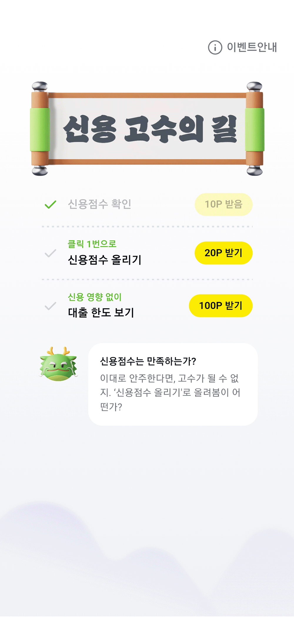 Credit Score Promotion rewards users with points for completing credit-improving missions. This feature is designed to funnel traffic toward loan comparison services, which serve as a primary revenue driver for the platform. I implemented a narrative-driven onboarding featuring "Yongsin," a character that guides users from the intro to the mission dashboard. This storytelling approach makes the reward system more interactive than a standard point-based service. Using Motion (formerly Framer Motion), I developed seamless transitions and refined visual effects to ensure a fluid, high-quality user experience throughout the entire flow.