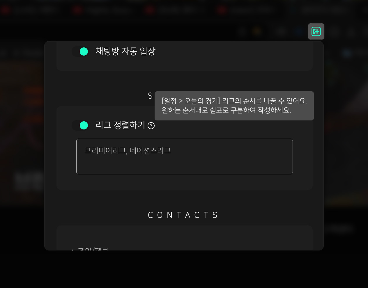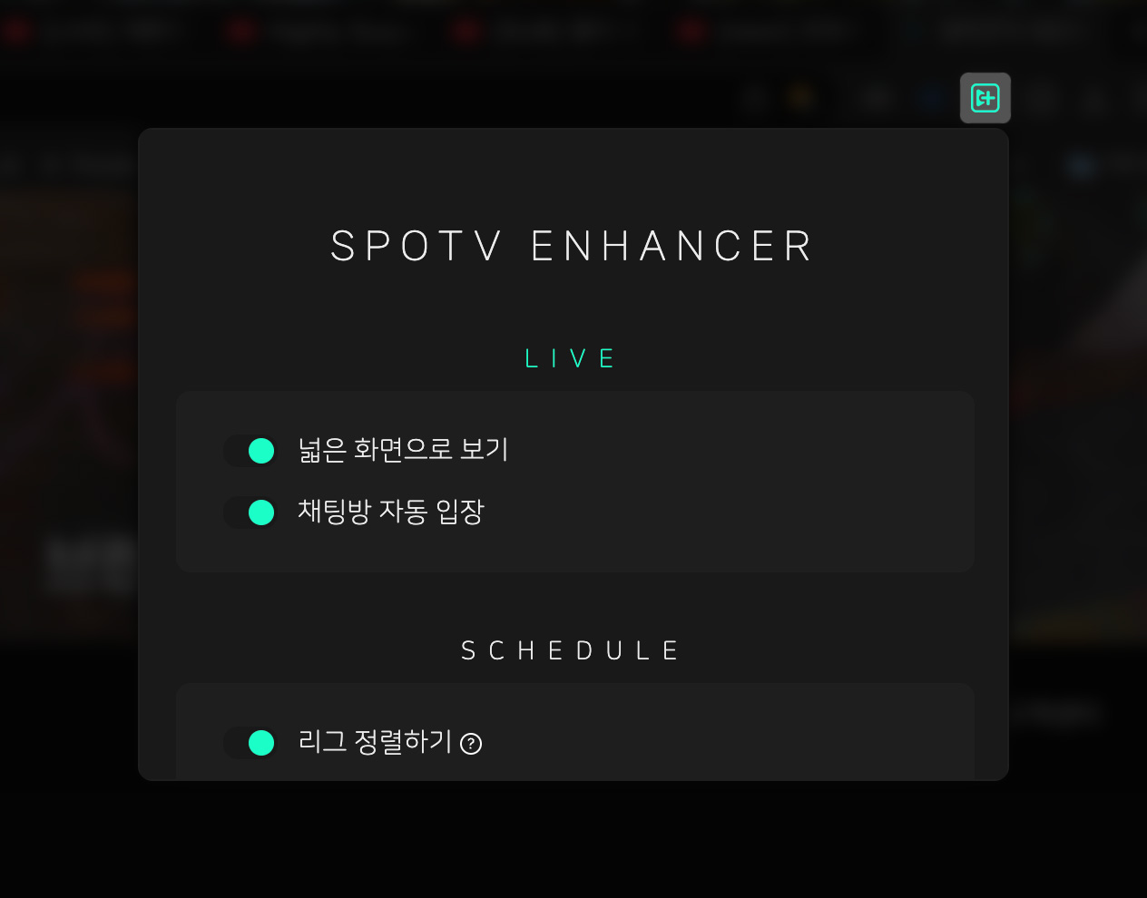 SPOTV Enhancer is a Chrome extension for SPOTV NOW, which was the exclusive broadcaster for the English Premier League in South Korea until early 2025. This project was born out of my frustration with the web player's layout, where I frequently used developer tools to manually remove max-width restrictions. This repetitive process eventually inspired me to create an extension to automate and streamline the viewing experience. The primary feature transforms the interface into a Twitch-like layout, maximizing the video area with a toggleable chat window. I also added quality-of-life features, including automatic chat entry and customizable league sorting for the match schedule.